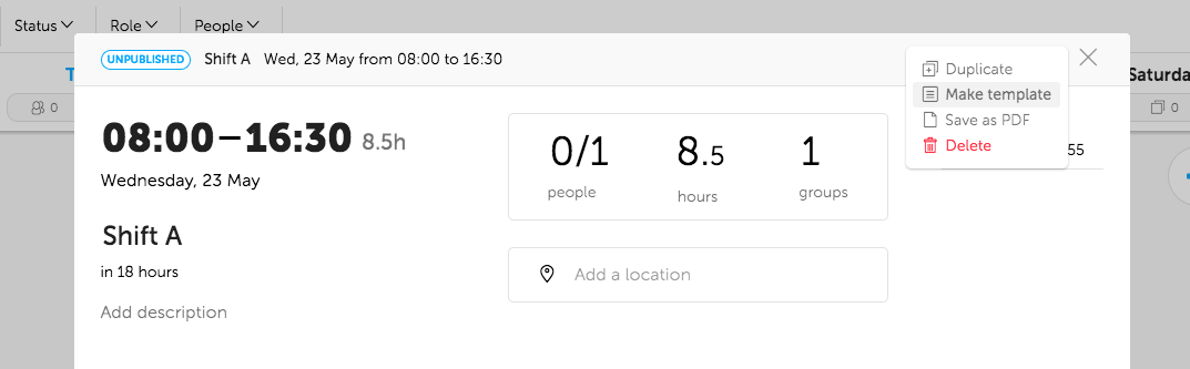 If you have many similar shifts, you can make a template of it. Just click on a shift to open the details then hit the "more options" icon ⋮ > Make template .