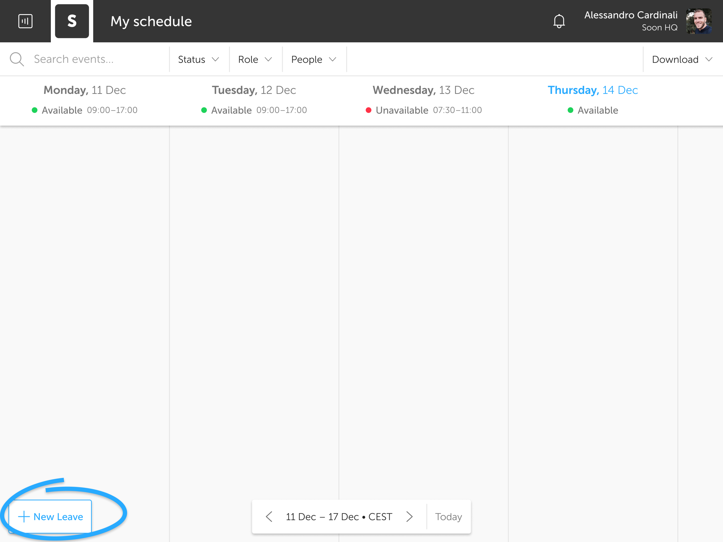 To create a leave request from the My Schedule page, you have to select the + New Leave button in the bottom left corner of the screen.