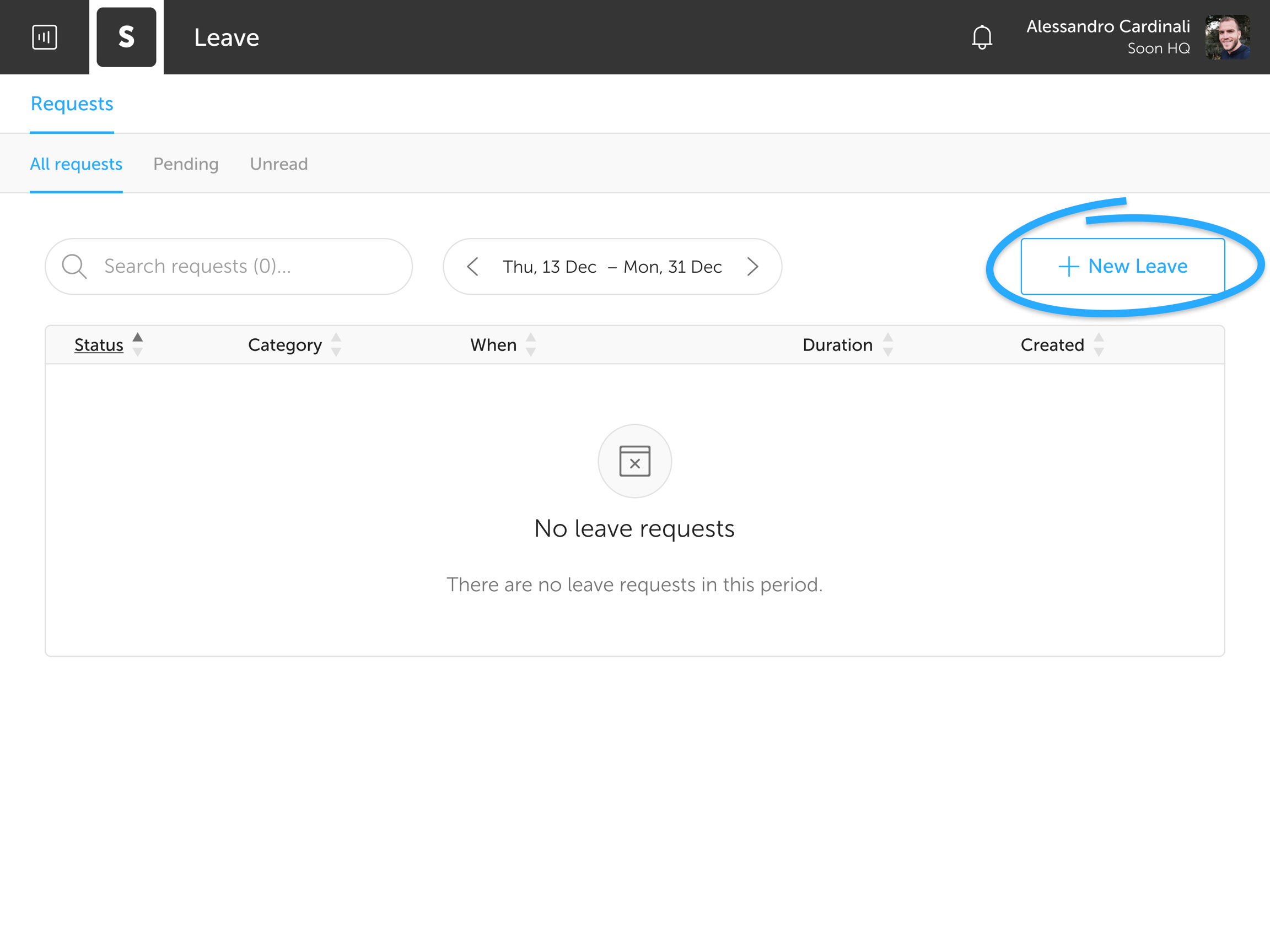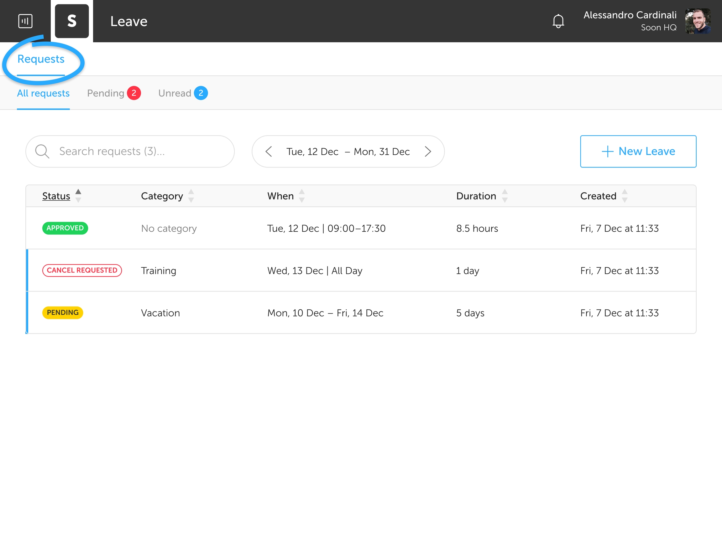 Managing leave is mainly done from the Requests section. All new requests and unread conversations are filtered under the Unread tab. Requests that are still awaiting approval from the leave manager(s) can be found under the Pending tab. Under the All requests tab all leave requests within the selected period are shown, regardless of their status. Clicking a leave request will open its details.