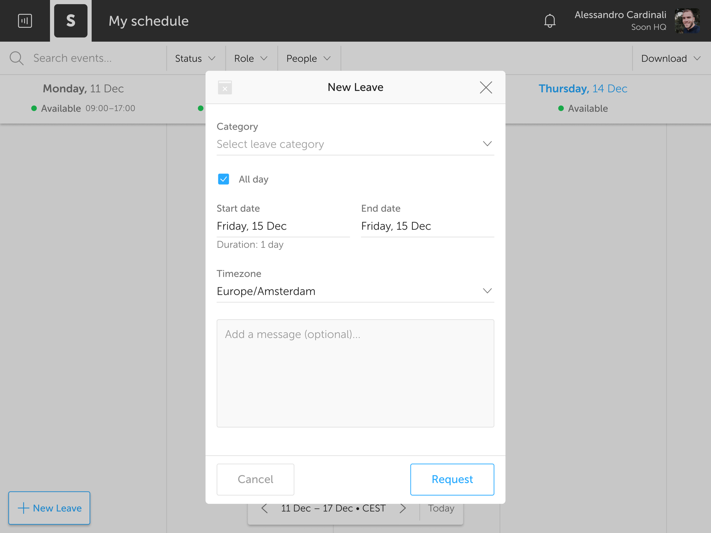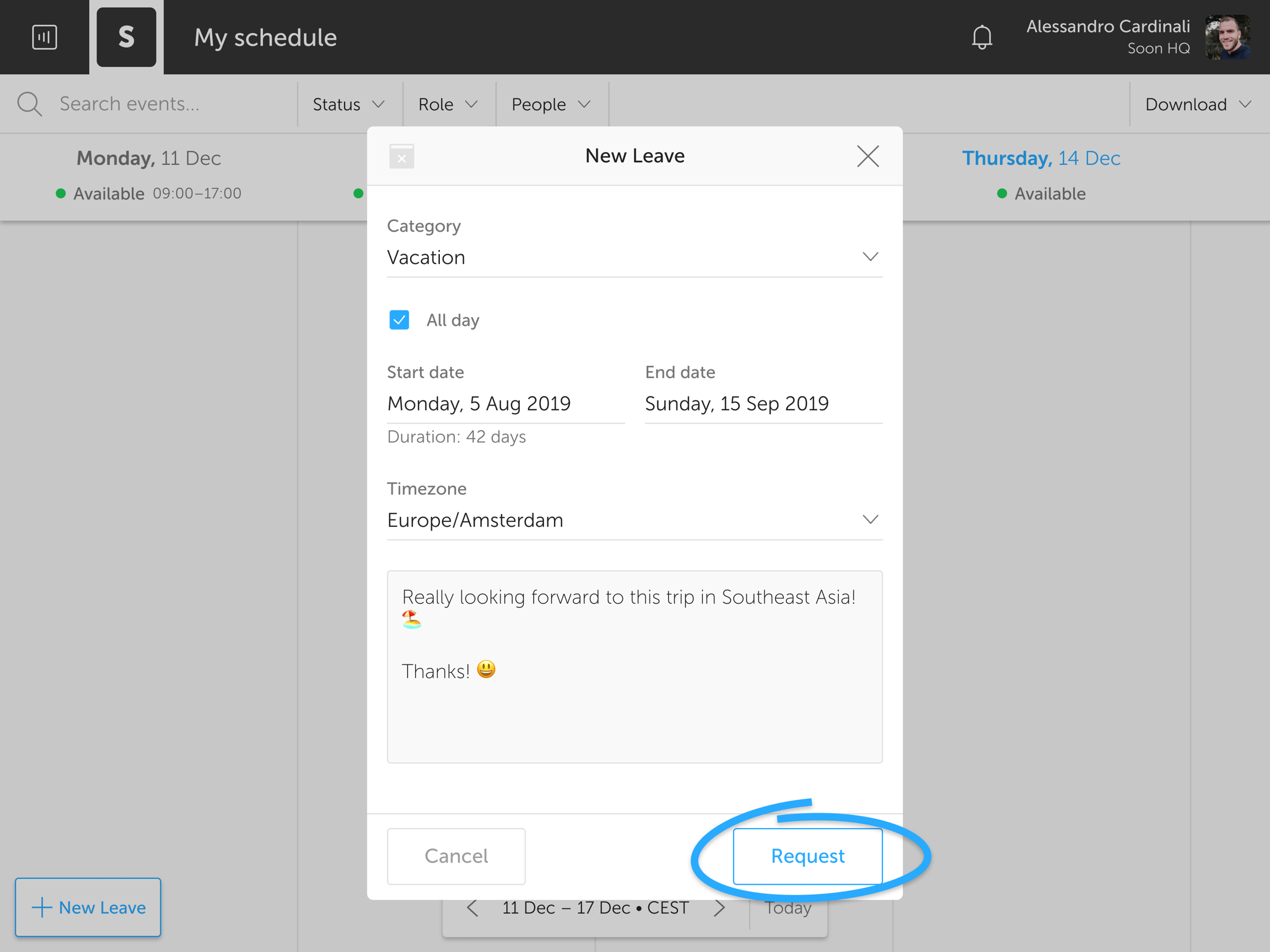 Next, you'll see the leave request modal: