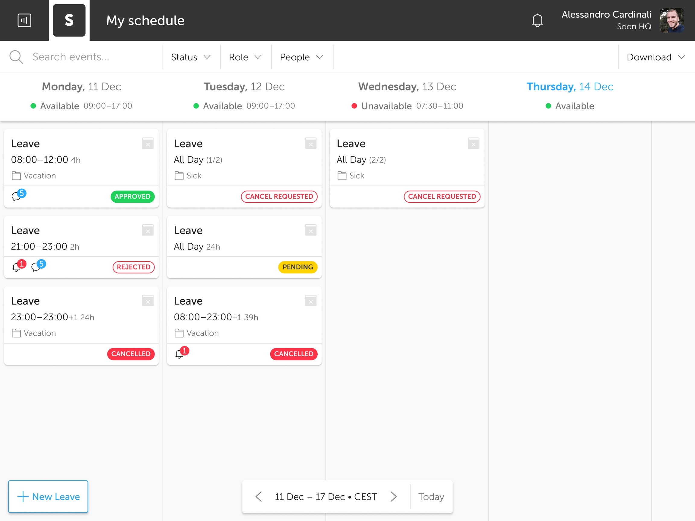While setting your availability is helpful to let your team know about your preferences with regards to when you would like to work (or not). For example to block out certain days because of class or soccer practice. Leave is a more formal approach to requesting time off and registering absence. Perfect for unique events like holidays, sabbaticals, sickness, training, and more.