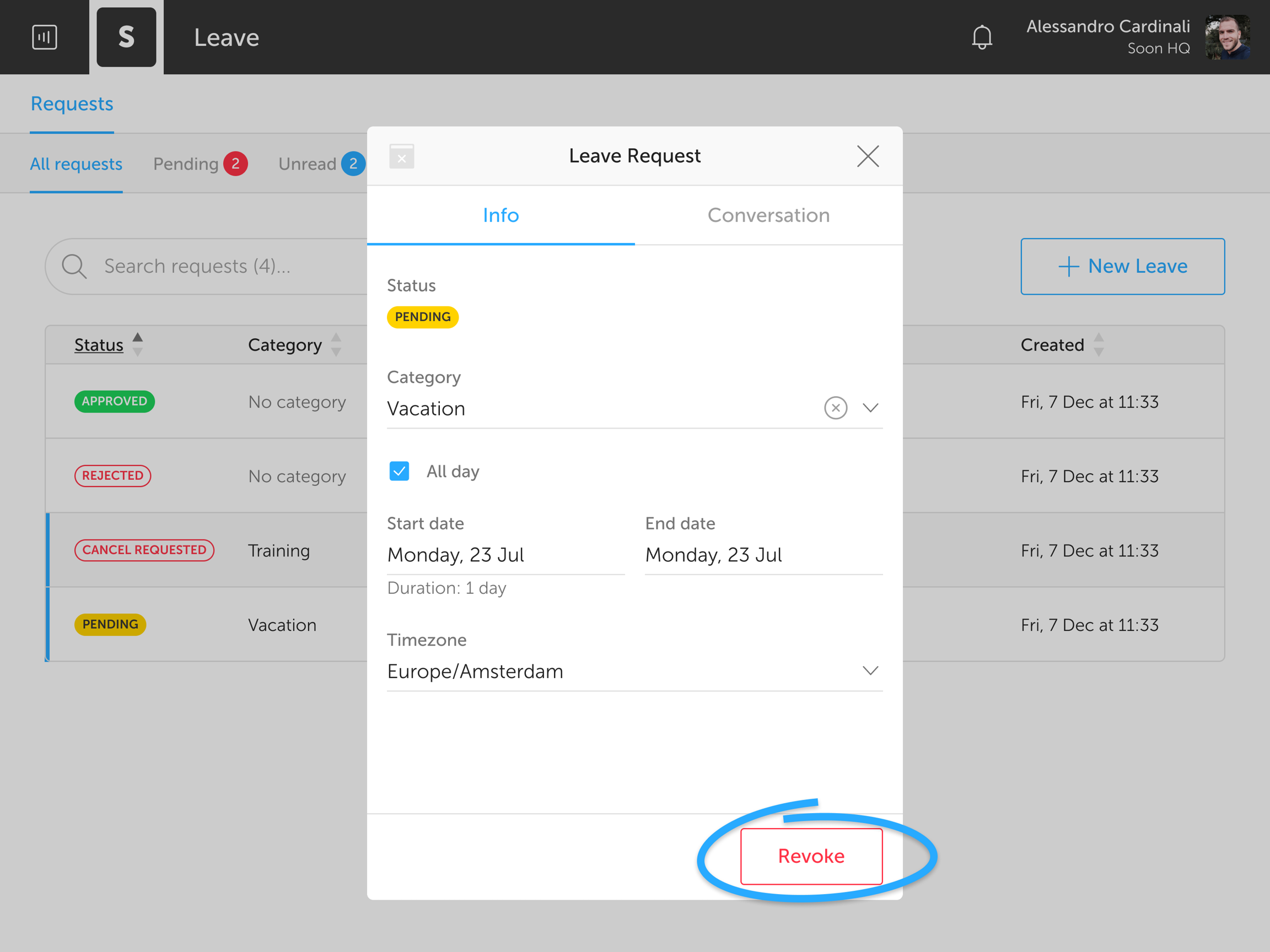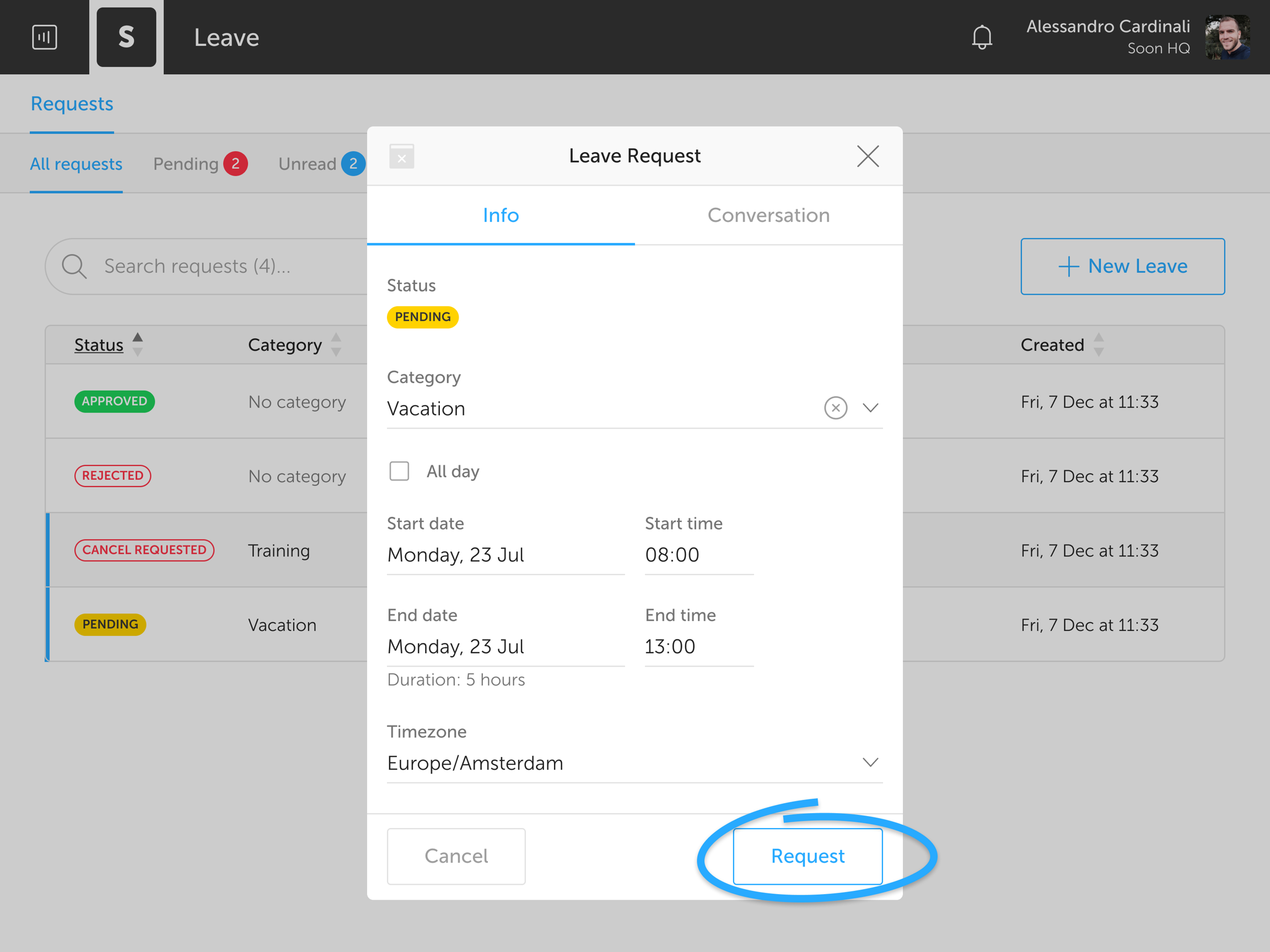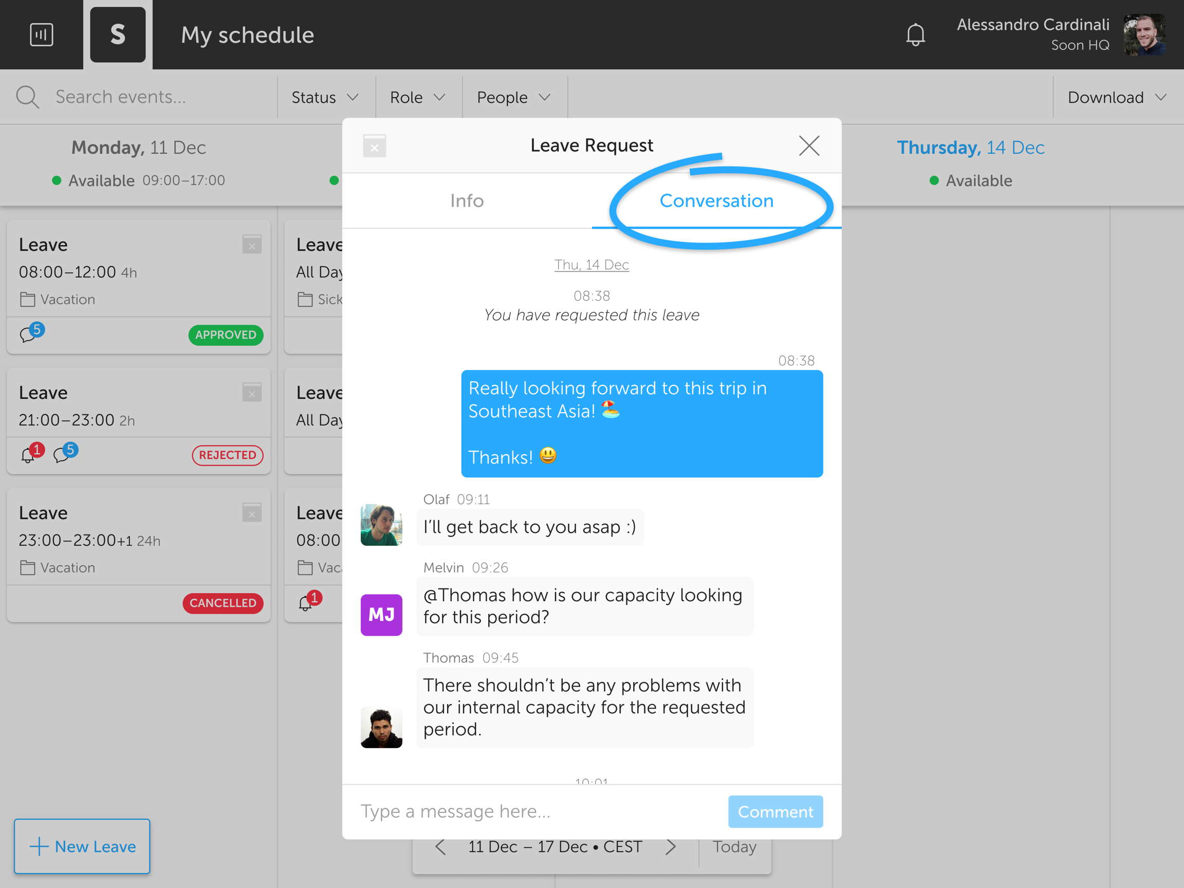 Your team's leave managers get notified and will respond by either approving or rejecting your request. Meanwhile, you can talk about the request with them in the conversation tab. Just click one of the Leave cards and head over to the Conversation section.